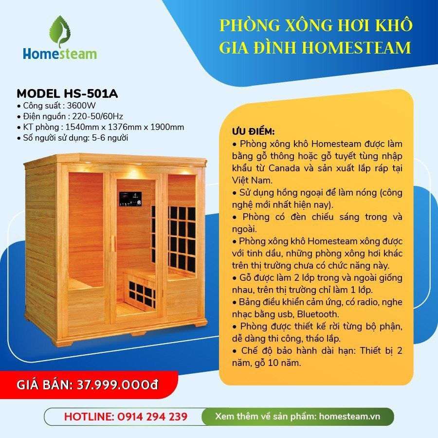 - Phòng xông hơi khô Homesteam HS – 501A sử dụng được cho 4 – 5 người